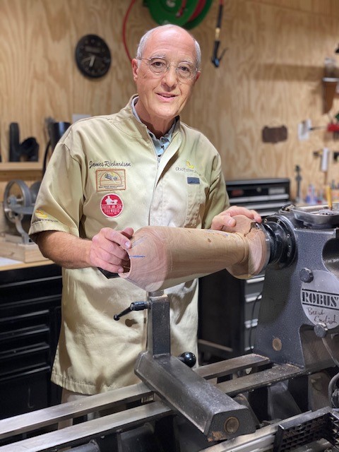 James is a retired Agricultural Economics Professor from Texas A&M University. He has been turning wood since 2012 and prefers to work with Mesquite and any other wood that is handy. He mainly turns bowls, hollow forms, and Alumilite burls. He is best known for turning a bowl that has a rusty, hand forged horse shoe in the middle. James found the horseshoe while turning a bowl from a large Mesquite tree that grew on the trial Santa Anna’s army used on the way to the Alamo. Some say, “Santa Anna’s horse lost a shoe on the way to the Alamo and James found it 180 years later.”